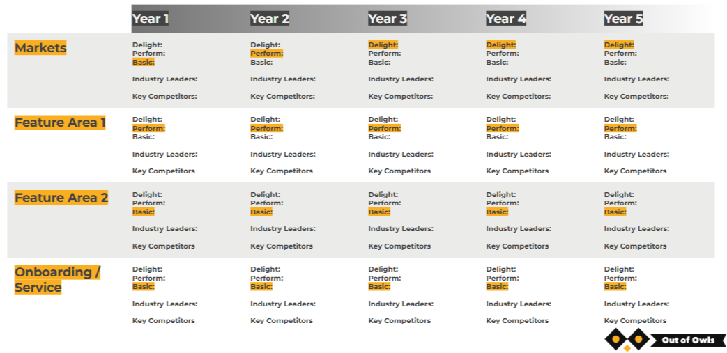 For each of the key Competitive Areas - be it Markets, Feature areas, or Experience/Perception - we asked the Product team to describe the state of the market as it currently is. If it was electric vehicles, for example, one of the key Feature Areas might be Range, with 150 miles as the Basic level and 500 as the Delighter.